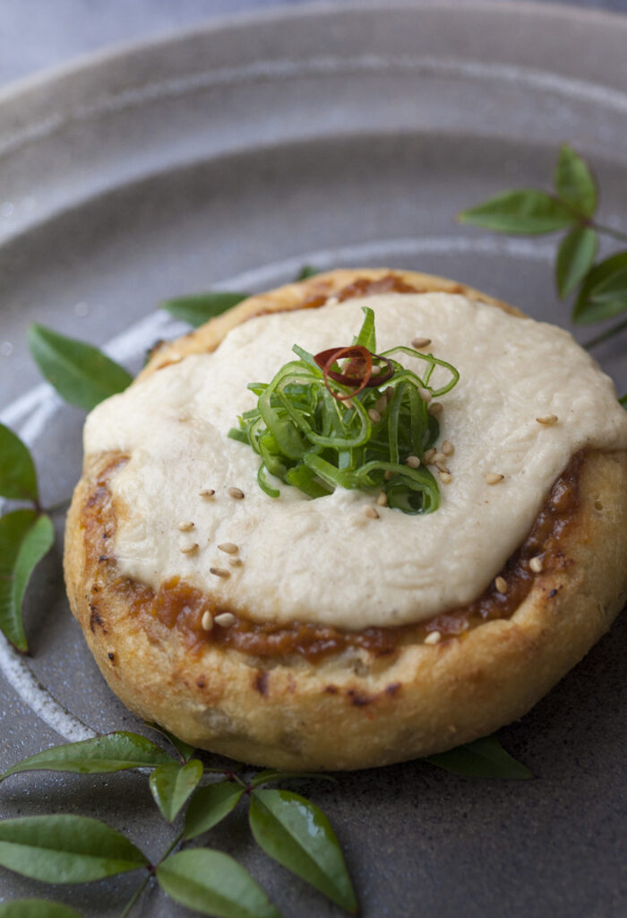 3.ごぼうがんもに、特製味噌をぬり、とろろをのせてトースターでこんがり焼く。