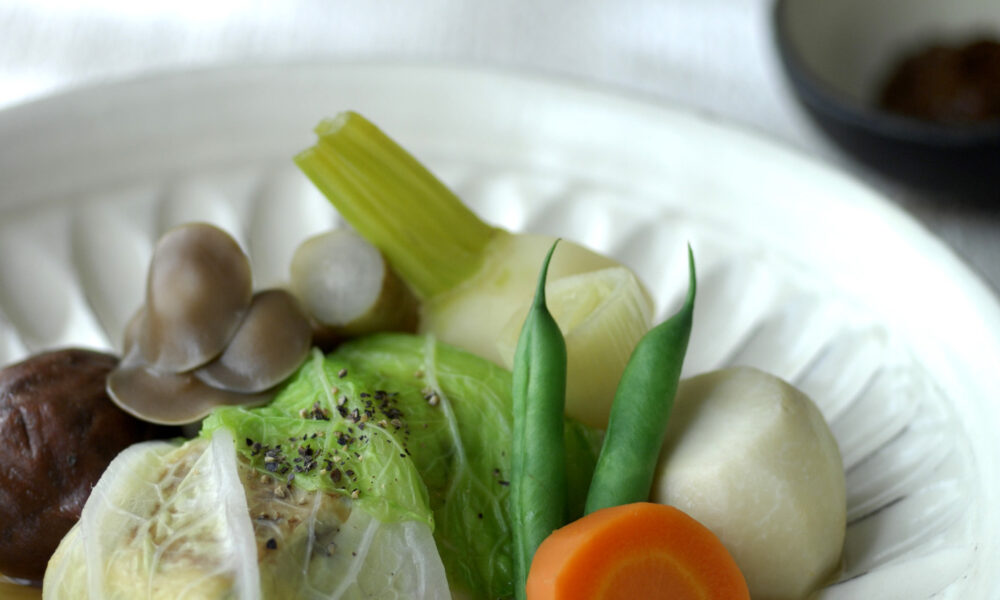 て、よくすり混ぜる。じっくり煮た『こんこん』と野菜を形良く盛りつけ、ごま油少々を