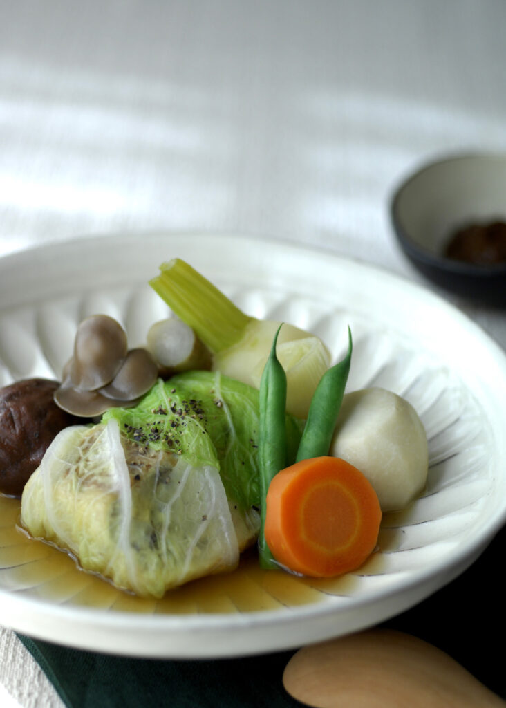 3.きのこ、白菜で巻いた『こんこん』も加え、弱火でじっくり煮る。