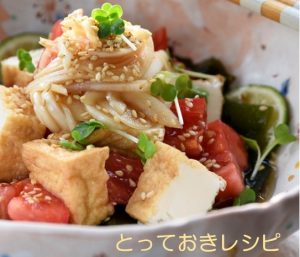 器に食べやすく切った小絹あげとトマトを一緒に盛りつける。 - 1のドレッシングをかけ、味がしみた新玉ねぎもたっぷりと盛りつけていただく。