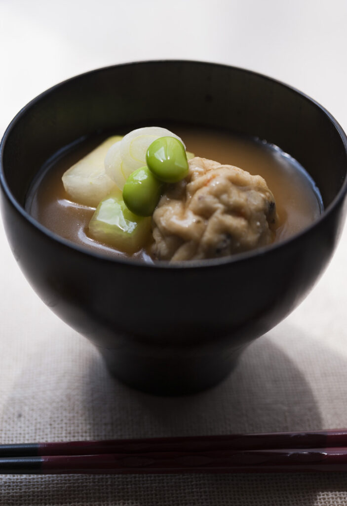 2.1に京がんも、ゆでた枝豆を入れあたため、味噌を溶き入れる。煮立つ直前に火からおろす。